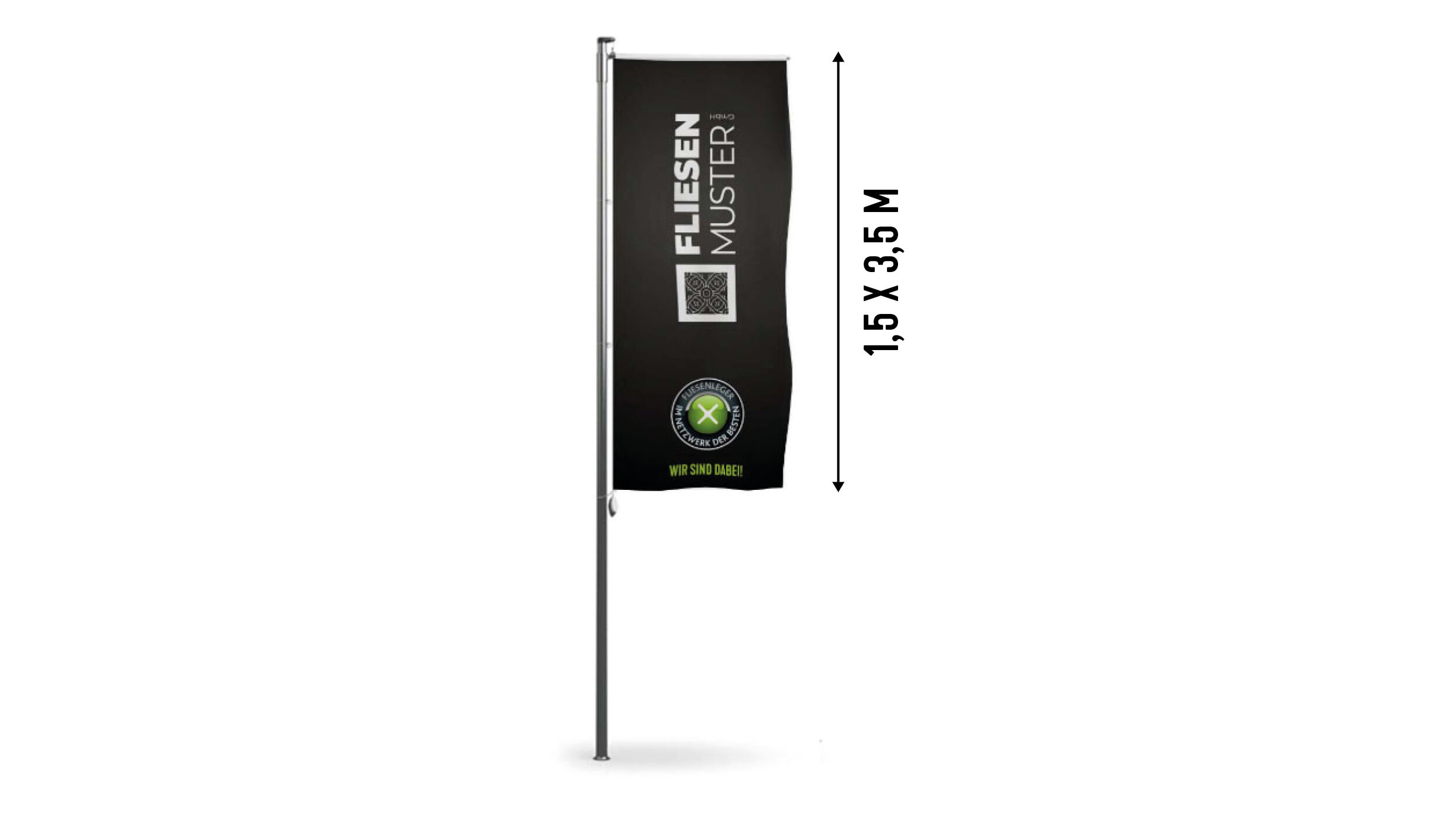 Die Netzwerk der Besten Fahne hat eine Größe von 1,5 x 3,5 Metern und damit ausreichend Platz um ihr Logo / Unternehmen schön zu präsentieren. Der platzierte Netzwerk der Besten Button unterstreicht zusätzlich Ihre Qualität als Fliesenleger.